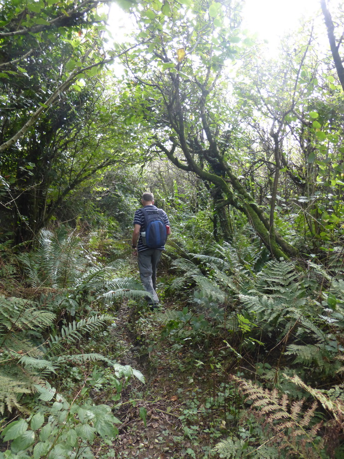 Reaching the top, the views became better and better and there was a real feeling that we were climbing an escarpment. Sure enough, there ahead of us was the low valley of the Tamar while behind us stretched the coast from Tintagel to GCHQ. Our end-point had been well-chosen.