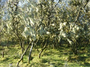 This narrow road twisted and turned between bare Cornish walls constructed of granite boulders taking us past some small celtic fields and on, past a delightful and tiny Methodist chapel at Highertown. The way then descended into another valley and across a stream at Watergate (not, as far as we know, any relation). Here the air was so pure that lichen hung from the trees like wool discarded by the sheep who now inhabited the fields.