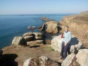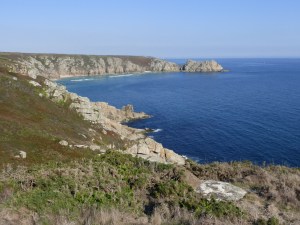 One headland and there before us was one of the most famous views in Cornwall: Treryn Dinas with its Logan rock. In front of us was the Minack rock. The sounds of Chicago the musical could just be heard on the breeze, emanating from the matinee performance at the theatre. This area is as familiar to us as the view from Cudden head or the sweep of Kenneggy bay.