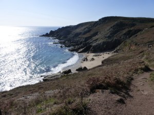 A step further on and we were passing above Porth Chapel, where one of us mis-spent his youth, surfing and swimming. At the head of the beach stands the small overgrown chapel and holy well of St Levan, matching the well and chapel of St Agnes at its sister cove of Chapel Porth on the north coast.