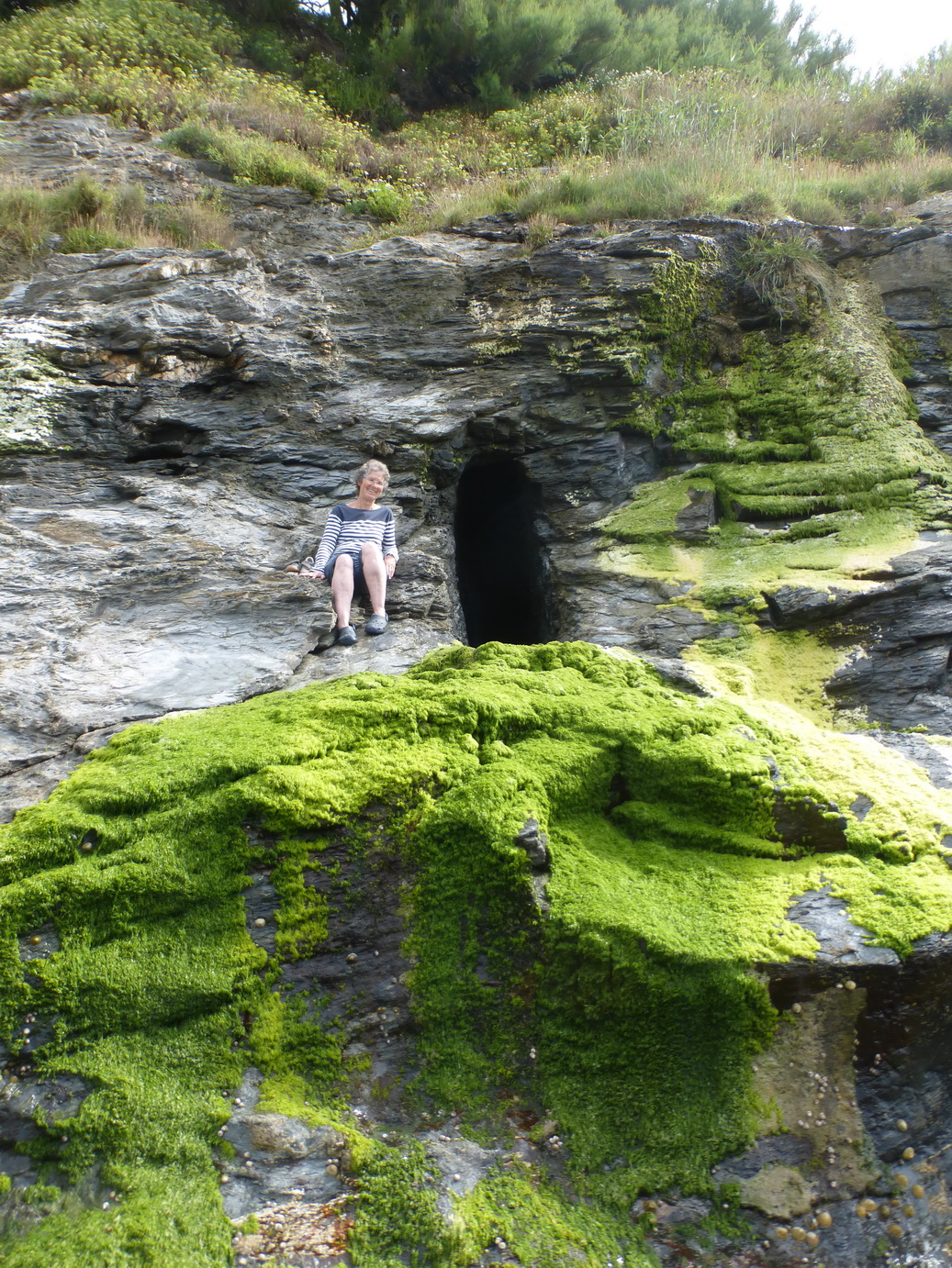 About 2-3m above the beach, at the northern end of the beach, is the entrance to what looks like a mine adit (there is another at a lower level close by). Originally there were some steps up to this and the remnants can be see on the right but they have long ago been destroyed by winter storms. It is thus a slippery scramble to get up to the entrance (note the greenery).