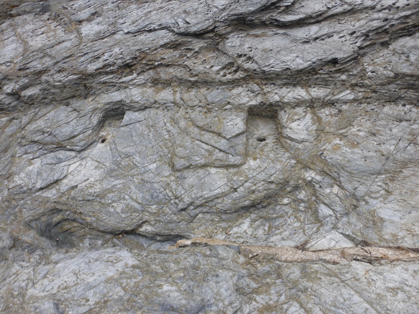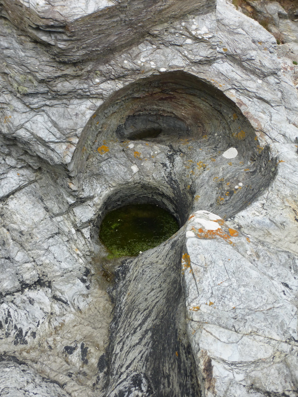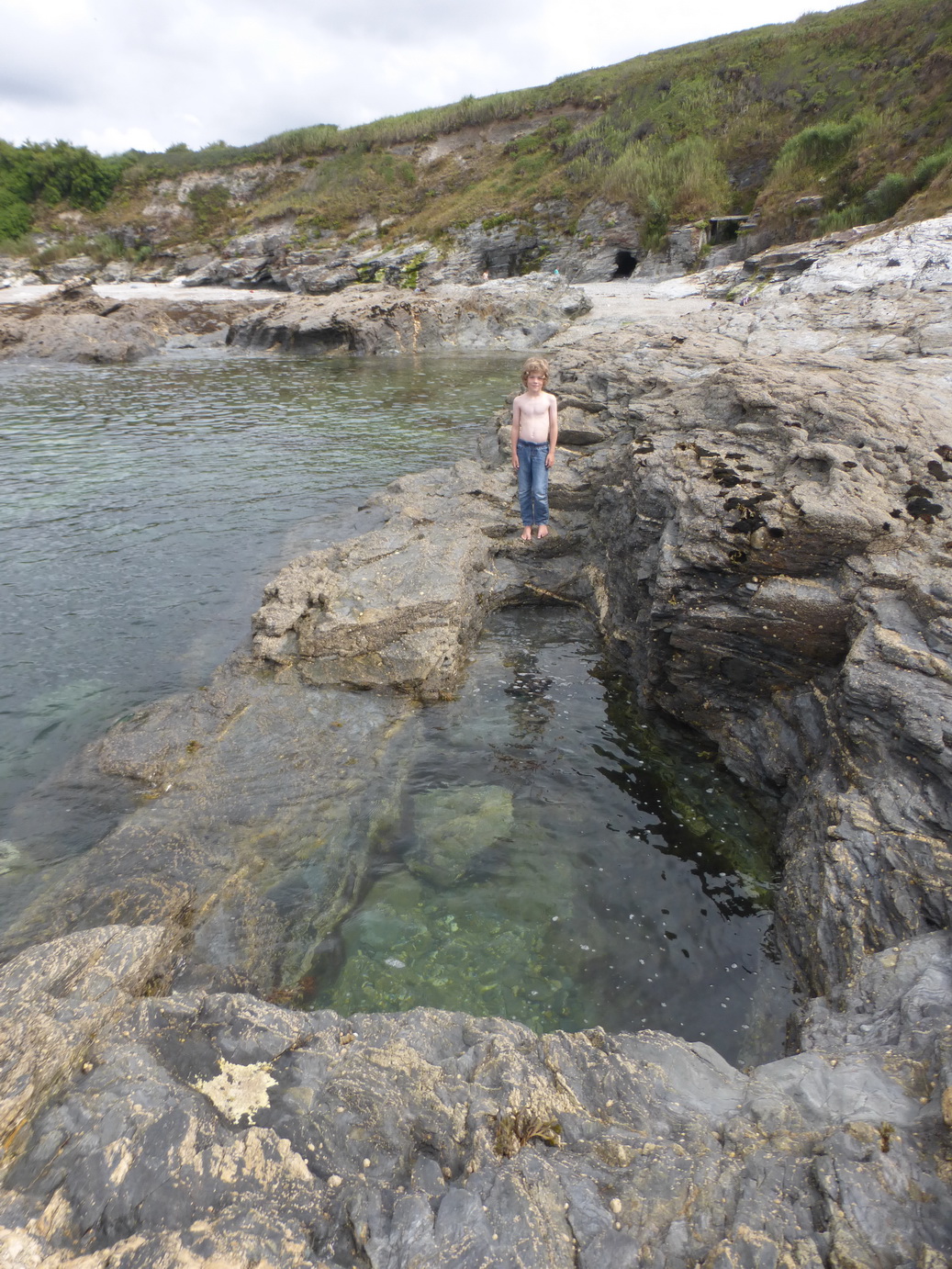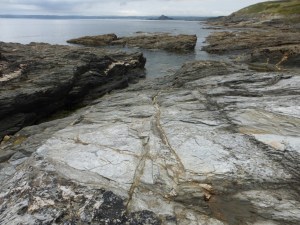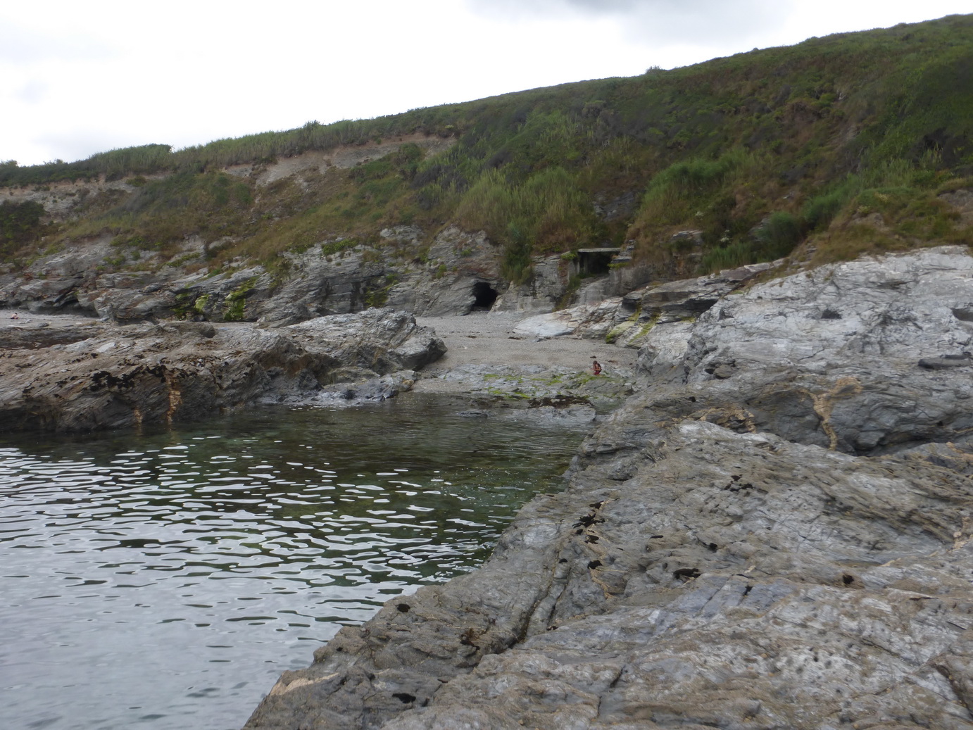 The main gully is wide and easily accessible for a boat (we have sailed into it in the past). Similar gullies were excavated out of the sedimentary rock round the corner at Prussia Cove.