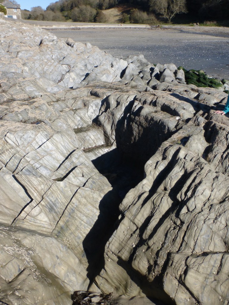 A fine, almost spring-like October day took us in search of the bath. Having scoured the rocks around the beach and asked other visitors who all denied any knowledge of a bath, our morale was dropping. We felt like those natural history photographers who capture ‘the shot’ in the last ten minutes of a one-week shoot. Then we found it. Tangye’s directions were spot on. It is indeed ‘at the edge of a slate rock foreshore on the north side of the cove’. In fact it is so obvious that we had walked past it several times before seeing the four steps leading down into it. It is here.