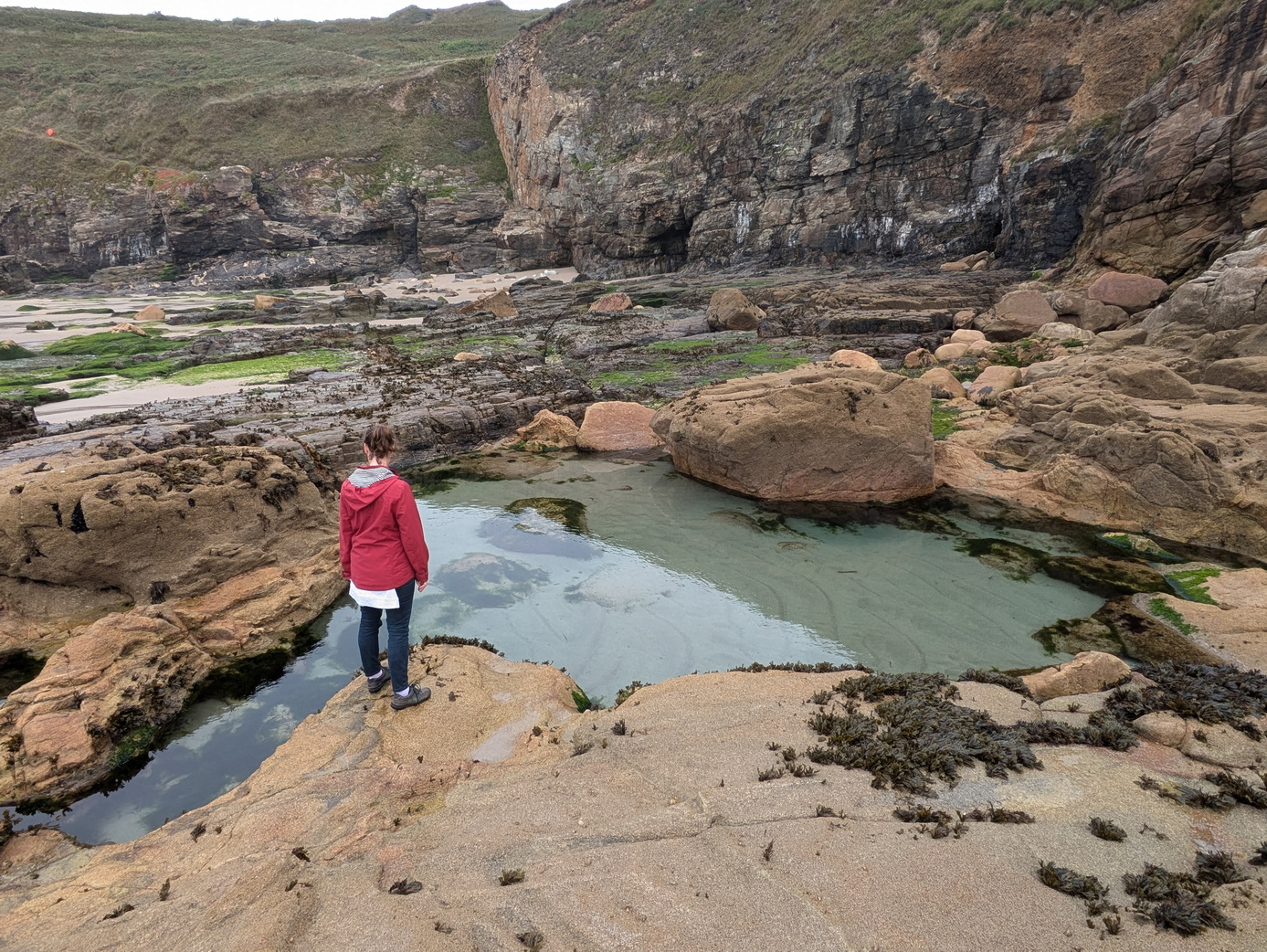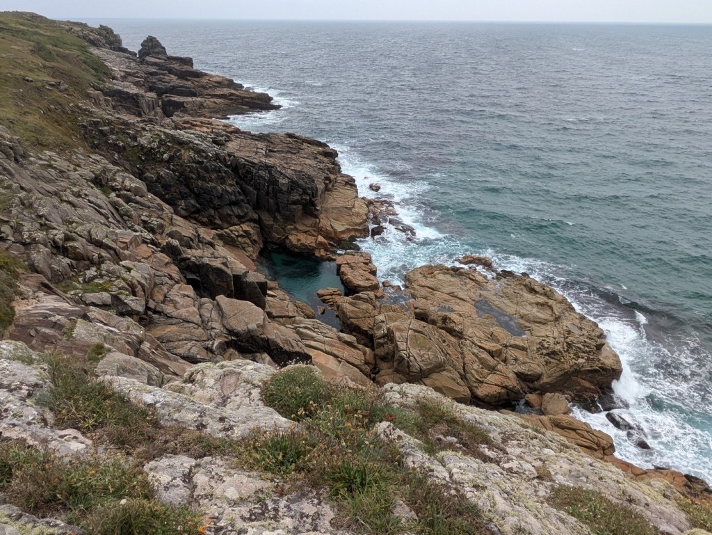 Back on the coastal path, we walked towards Trewavas Head and, just before the chambered cairn, spotted a much larger rock pool with a slab of rock alongside which would be ideal for fishing.