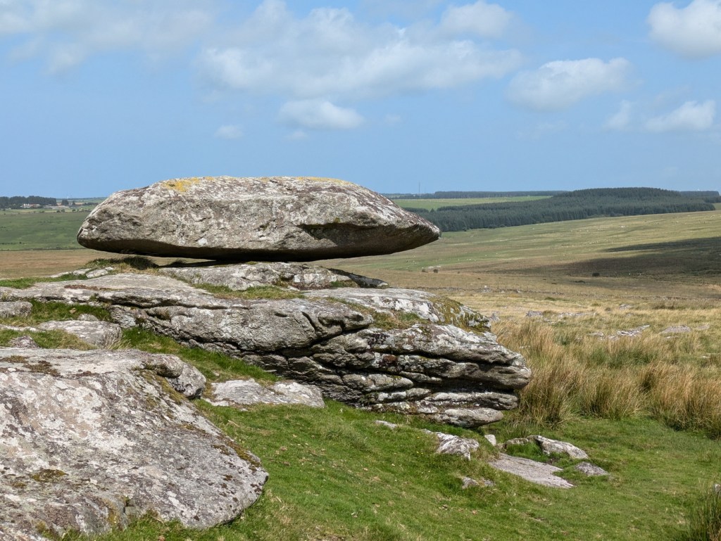 The next delight was a series of hut circles, very familiar in their basic form from places like Bosporthennis or Carn Euny (both Iron Age), but without the developed courtyards. Then, across open ground to the logan rock on Louden Hill which refused to move no matter how hard we jumped on it.