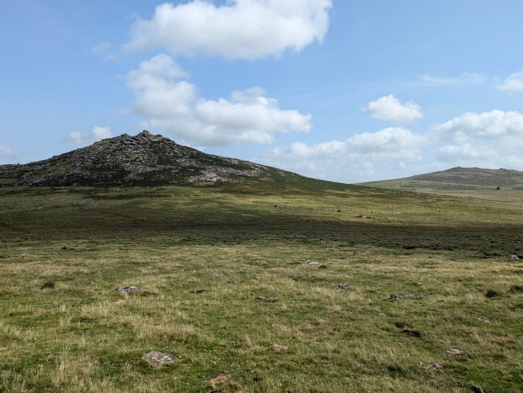 With the summit of Rough Tor beckoning, there was no real option: we had to climb it and descended into the shallow valley. To our left, the infant Camel stream made its way towards Padstow: to our right the infant De Lank headed off in the other direction before they joined up a few miles further on.