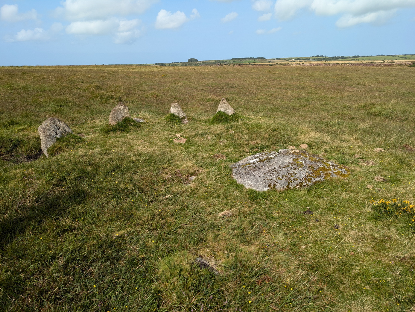 Only a handful of the 60 or so stones surviving stones are standing and higher than 1m tall. There are said to be alignments with Brown Willy (equinox sunrise) and Louden Hill (sunset on 1 May).