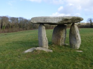 Nearby is the Giant’s Quoit (Carwynnen Quoit or ‘Giant’s Frying Pan’) at SW 650373. This easy to find as it stands in a field alongside the lane from Troon to Carwynnen. It has been restored several times, lastly in 2014 when the capstone was raised onto the three supporting stones.