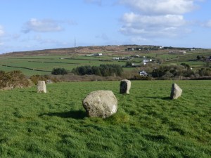 The Nine Maidens Bronze Age stone circle (also known as Wendron stone circle) is close to the B3297 road at SW 683365. There is a lay-by opposite a farmhouse on the crest of the hill. Across the road, in the field to the right are four remaining maidens: three regular stones and one ‘fat’ one with lots of quartz glinting in the bright sunlight. The granite bulk of Carnmenellis looms in the distance.