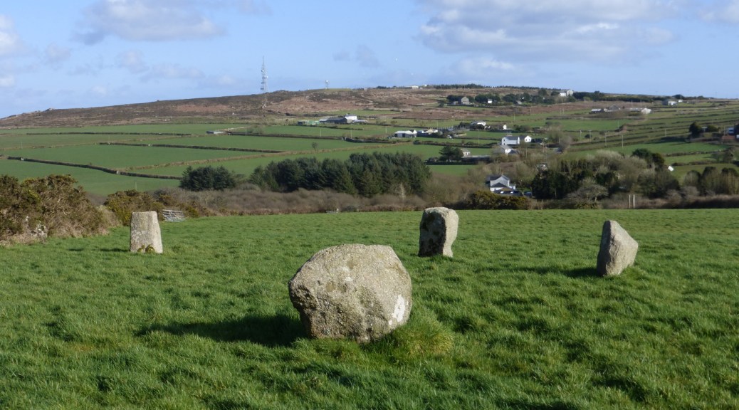 The Nine Maidens Bronze Age stone circle (also known as Wendron stone circle) is close to the B3297 road at SW 683365. There is a lay-by opposite a farmhouse on the crest of the hill. Across the road, in the field to the right are four remaining maidens: three regular stones and one ‘fat’ one with lots of quartz glinting in the bright sunlight. The granite bulk of Carnmenellis looms in the distance.