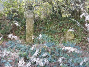 A final joy was hidden under a hedge at the edge of a bramble patch, below a modern embanked road: two of the saddest-looking wheel-headed crosses we have yet come across. They stand side by side, apparently neglected. Leaving crosses in situ is clearly a preferred strategy but it seems sad that these two have not been given a more decent prospect than looking out at brambles and listening to the road of the A30 fifty metres away.