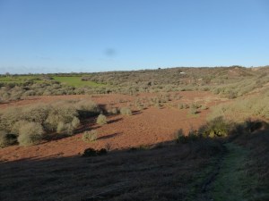 Somewhere here, amongst the dead and brown bracken, we were told to turn off at a ‘solitary hawthorn tree’. It is a mistake to use trees as waypoints, certainly in an area which was covered in hawthorns. We chose one and found something of a path which led in much the right direction and continued, hopping from tussock to tussock. ‘In winter this path can get wet underfoot’ said the guidebook. I should say it can.