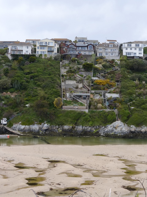 Emerging on the banks of the Gannel, it was clear that we were approaching civilisation for the opposite – Pentire – bank was filled with smart houses whose estates tumbled down the steep cliff. Different solutions were adopted by the owners: meandering paths through vegetation, smart lined lawns to rigid modernity. We pondered on how often they carried food to the ‘sitting areas’ at the bottom of the hill, only to find that they had forgotten the salt, or wanted another drink.