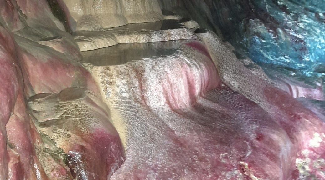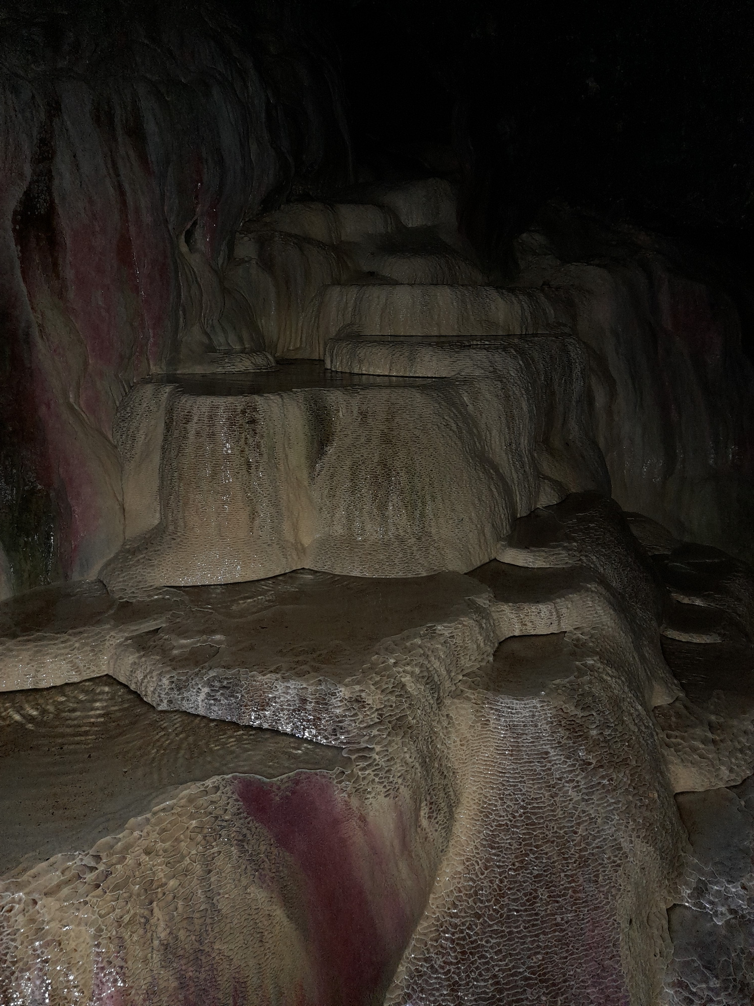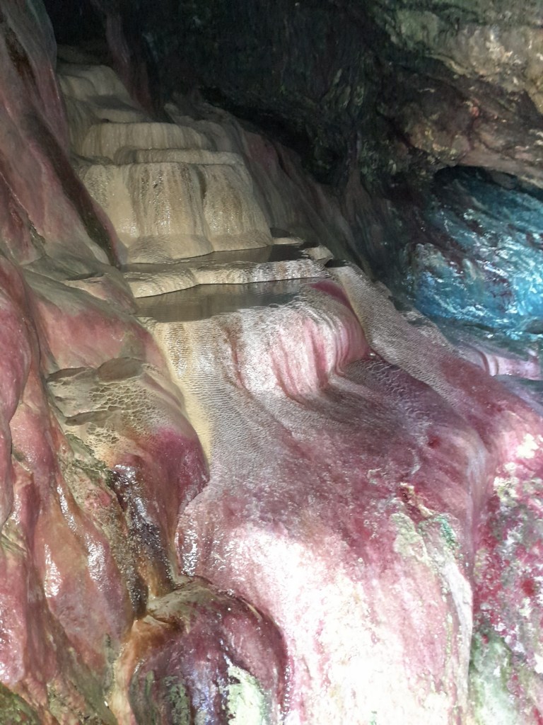 The water in the well runs slowly down a cascade of steps, each with its own pool of limpid water. Over time, the water has dropped off a layer of minerals resulting in a smooth, highly-coloured surface: a flowstone, which is a form of horizontal stalagmite. Tradition has it that every visitor should drink from the well.