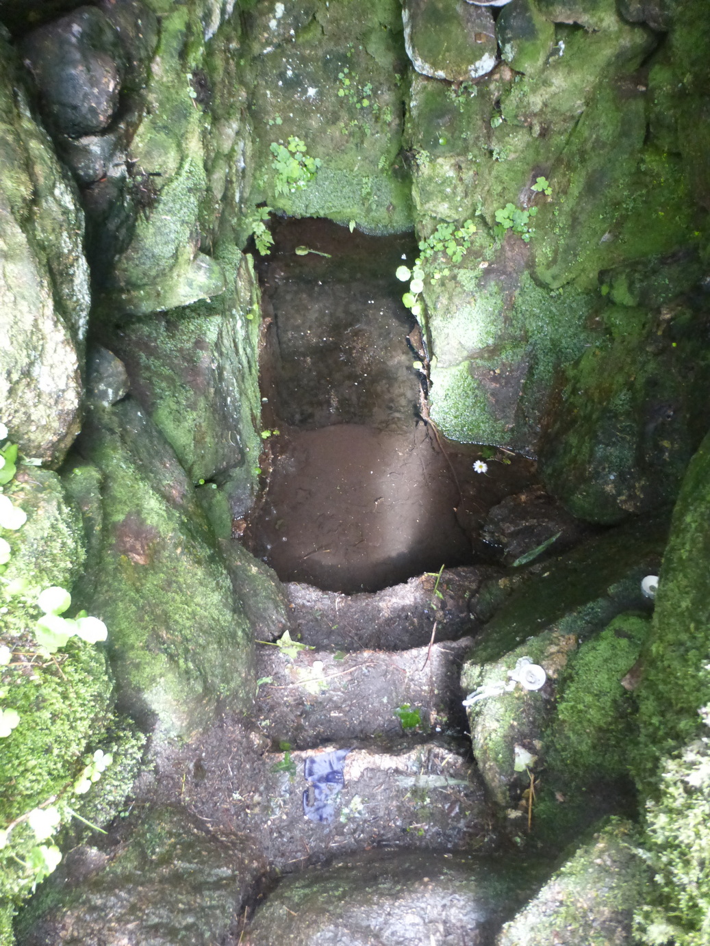 It is a well cared for well with the usual collection of modern votive offerings hanging from the trees alongside. Cut stones and redundant iron fencing suggests that it has been managed over time; a tyre hanging from a tree that it is currently a meeting place for children.