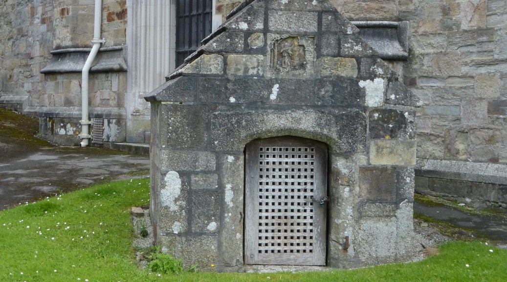 St Guron’s well is easily located in the churchyard of St Petroc’s church, Bodmin. The small C16 well house stands at the west end of the church. Above its tiny door is a much-decayed carving of a praying monk, presumably the saint himself.