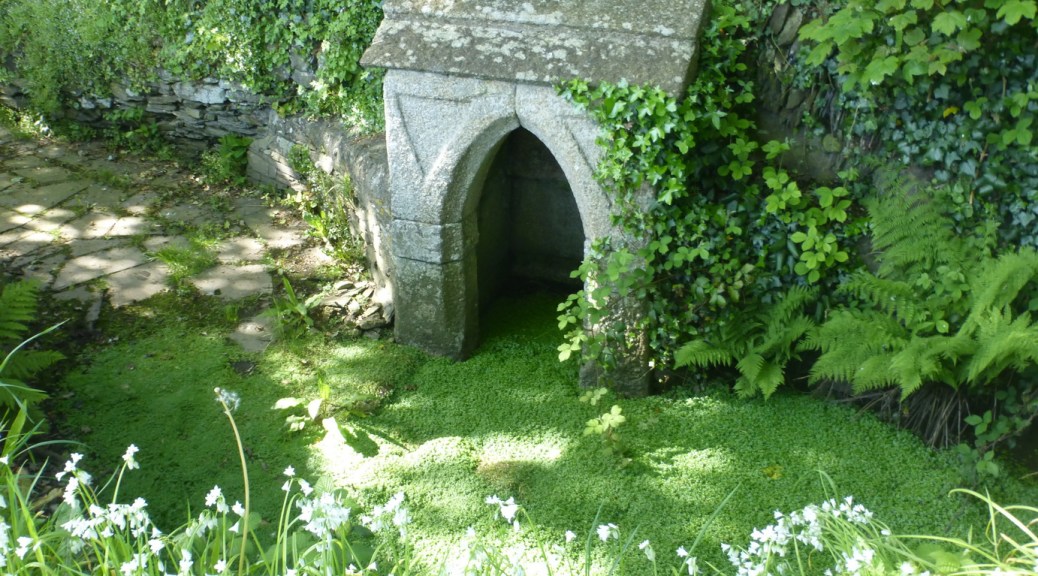 St Lalluwy’s holy well stands on Bowling Green, a short distance from Menheniot church. Seen on a sunny spring morning when the leek are in full flower, it is a joy.