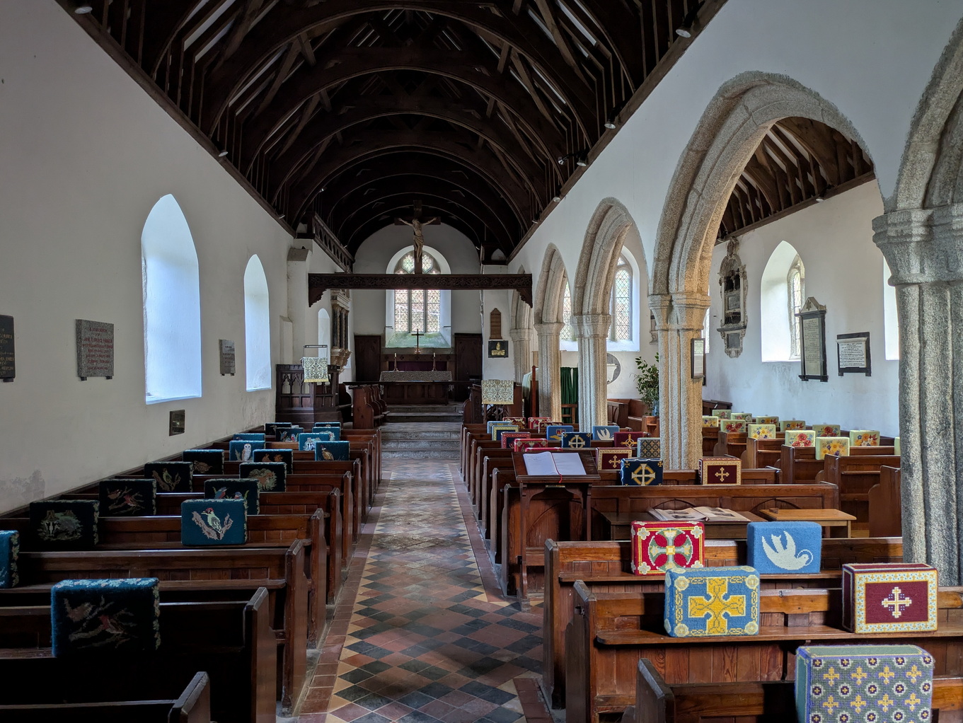 The interior is simple with a nave and C16 south aisle. St Aubyn hinted at the position of the rood screen with a single beam and thankfully there is no Victorian glass to darken the space. The rather charming positioning of the hassocks provides colour and interest to the otherwise mundane Victorian pews.