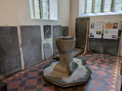 Several excellent slate gravestones have been displayed on the walls around the simple Norman font in the south west corner while two C17 memorials involve Cotton couples kneeling face to face for all eternity.
