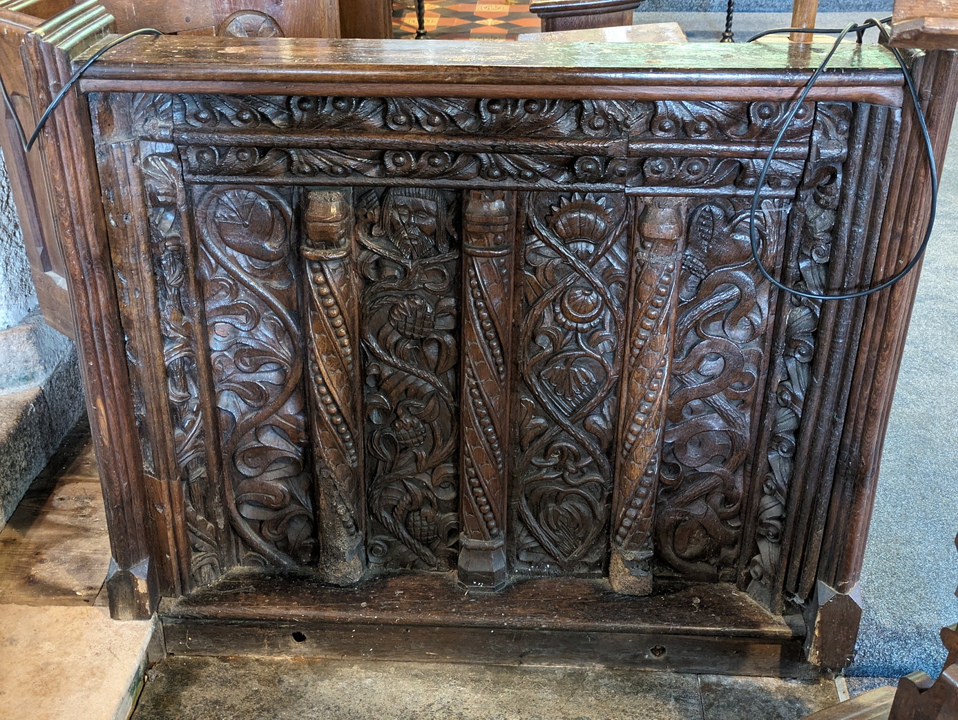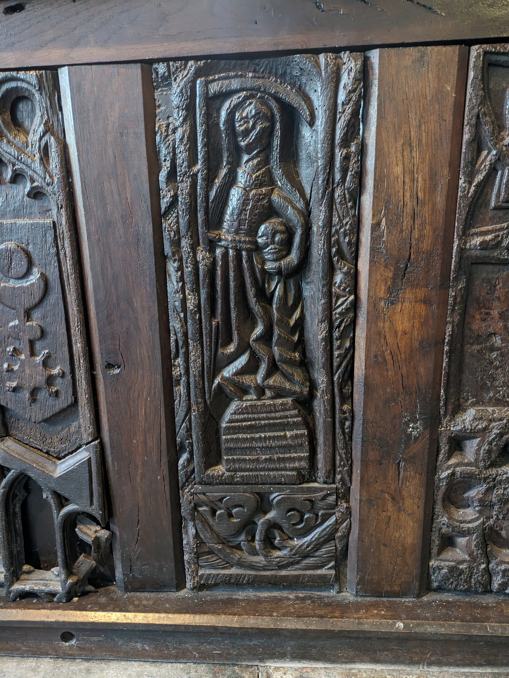 The lower half of the rood screen still survives with some elegant carving, while what were probably bench-ends have been incorporated into ‘modern’ pews quite effectively. Father Time stands out, his scythe very evident and a head cradled under his arm.