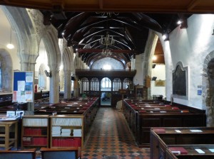 Inside, the church has the usual slightly lop-sided feel of one with only one side aisle – here the north – and a south transept. A set of low box-pews helps to give a charming tidiness to the nave.