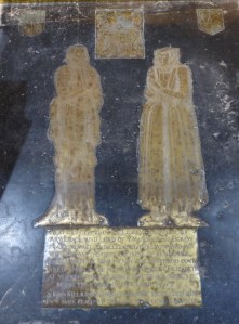 If the expert is around when you visit – and we were fortunate in this regard – then the central step wheels out on casters and the whole brass is revealed: Sir John (d1567) and his lady, Elizabeth Trewinnard covered over by a very solid piece of slate.