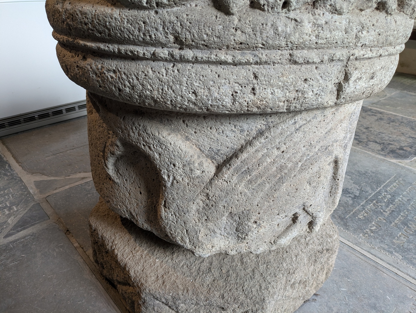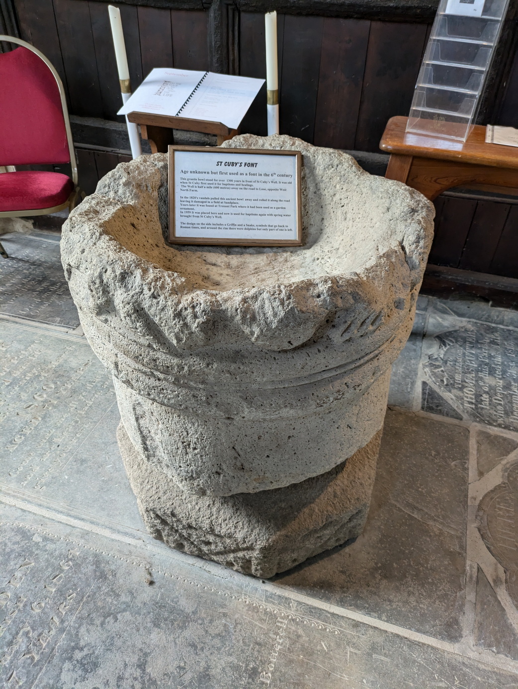 Also in the chapel is a stone basin – possibly C6th – which tradition says comes from the neighbouring St Cuby well. This looks remarkably like an early font with a dolphin on one rim and a griffin incised on the base.