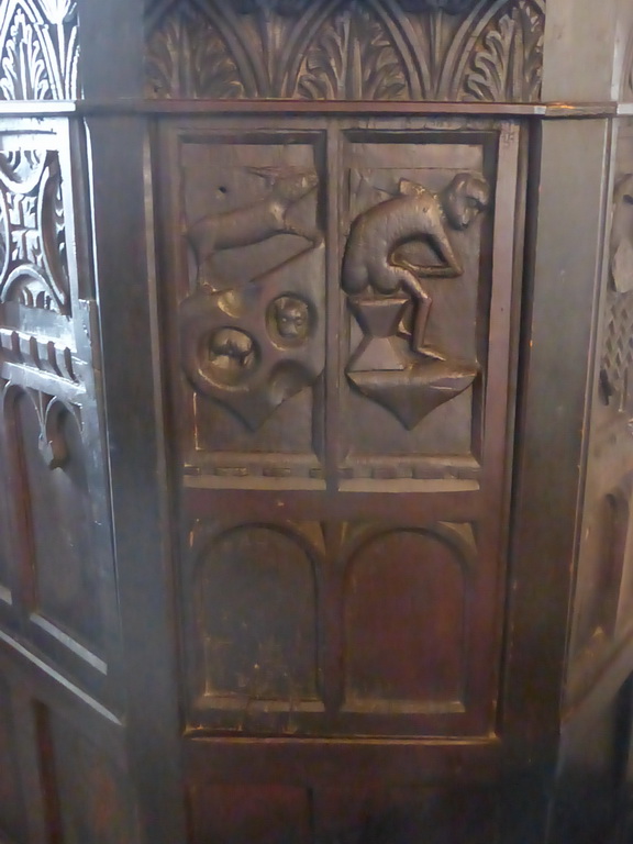 The best feature is the re-used bench-ends, taken from neighbouring Minster church. In many places these have been incorporated, often quite skillfully, into modern pews, but here those related the Passion have been inserted as the frontal to the altar with a simple light wood surround. The result is very effective.
