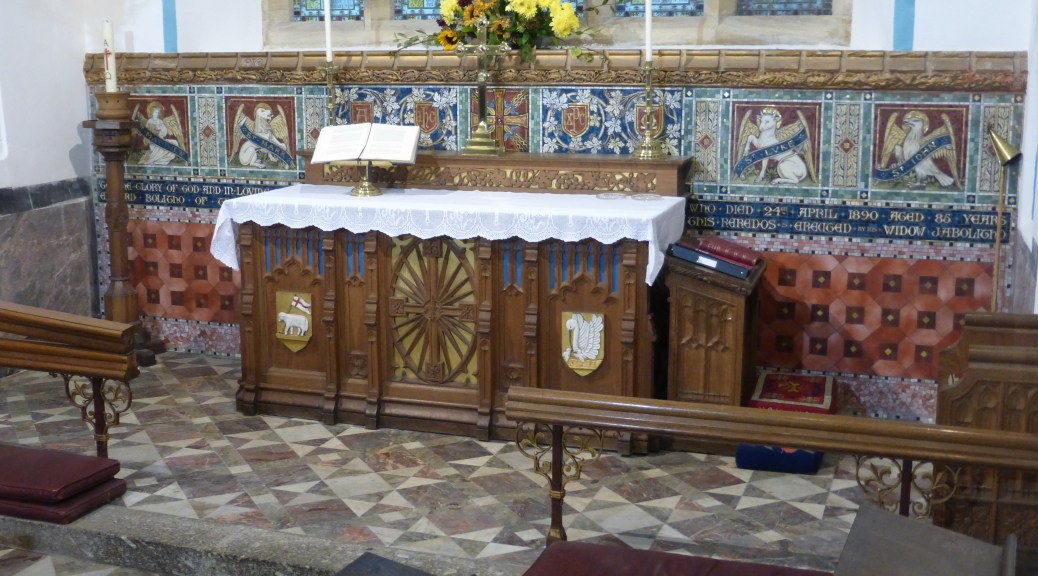It seems that the church underwent several restorations in the C19. Having one vicar – William Wingfield – from 1839 to 1913 certainly ensured continuity of style, helped, no doubt, by the involvement of JP St Aubyn whose family home was visible from the church. Certainly, they seem to have enjoyed the late C19 Gothic/Arts and Crafts style.