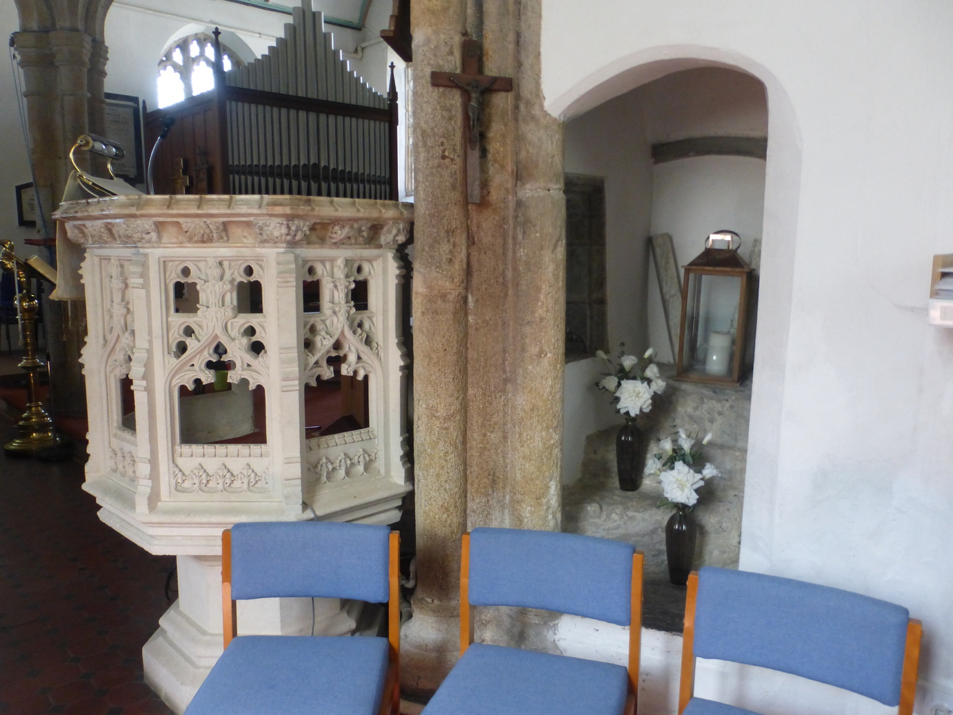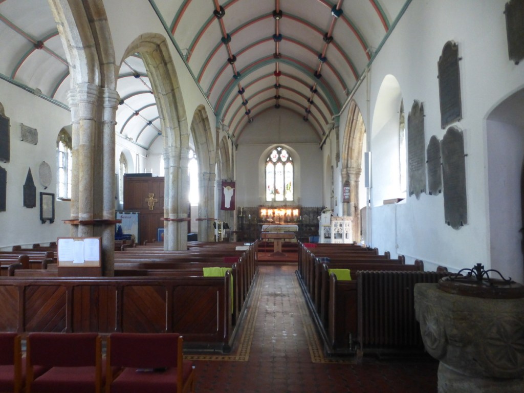 Inside, the first impression is of light and space. The tall C15 north aisle and the nave both have elegantly restored (C19) wagon roofs in soft colours with bosses painted by parishioners. The soft greenish local stone adds to the sincerity of the whole.