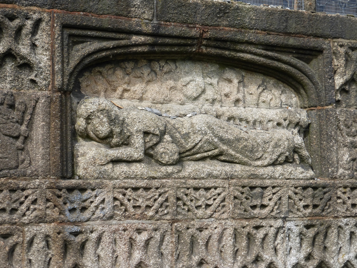 To return to the outside, on the eastern wall is a life-sized figure of St Mary Magdalene lying in wait in the Garden on Easter morning. By tradition, a stone that sticks when thrown on to her back brings good luck. On the wall beside her, musicians play their medieval instruments.