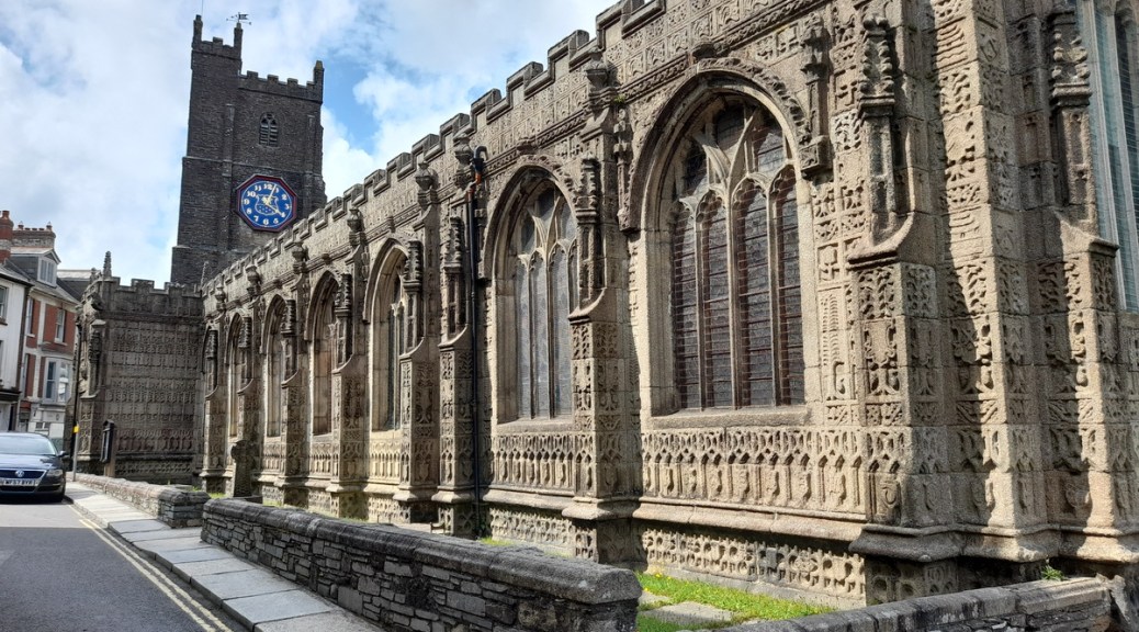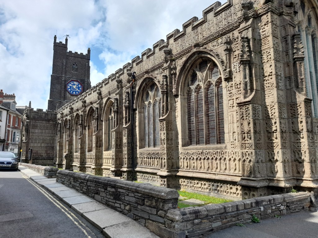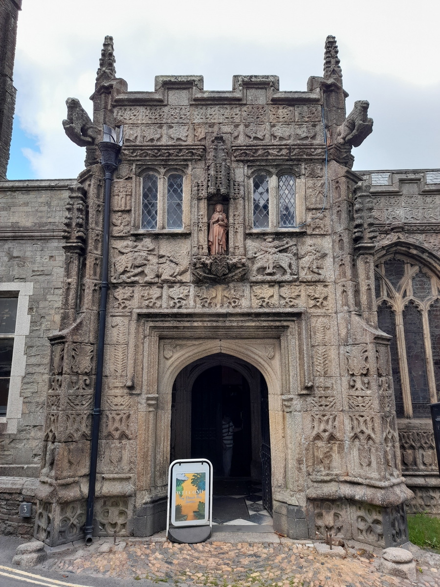 Situated in the middle of the former capital of Cornwall, it is a late church by Cornish standards, having been built 1511-1524, as the Reformation was about to burst upon the scene. Curiously, the church was not built right up to the C14 tower and there is an awkward junction between it and the church which is filled in with what could be described as a vestry house although it has had many purposes down the years. The main entrance is through a grand porch with images of St George and his dragon, and St Martin of Tours cutting his cloak for the beggar, both saints imported to Britain after the Crusades.