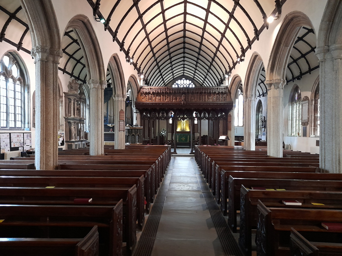 Inside, there are three wide aisles, each with a wagon roof. The chancel is surrounded by late C19/early C20 rood and parclose screens by the Pinwills in a very understated art nouveau style. We could have wished they had saved themselves the bother. The lack of chancel arch and continuous roof would look so much more impressive had it been left unblocked as at St Austell. The Oxford Movement has much to answer for.
