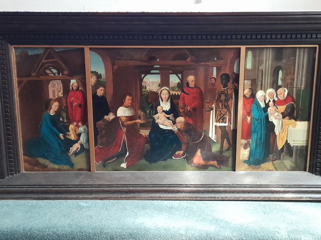 Through sheer personal bias, we loved the altar frontal in the south aisle/Lady chapel which is an excellent copy of the Hans Memling late C15 Adoration of the Magi triptych (the Prado Triptych) a copy of which has hung on our wall for many years.