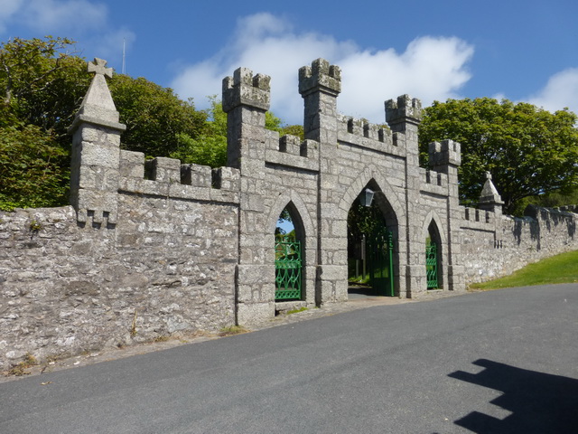 The entrance gate, indeed, the whole churchyard is surrounded by an embattled wall which has echoes of Victorian railway architecture. Betjeman referred to it as a ‘toy fort’. It is certainly somewhat bizarre.