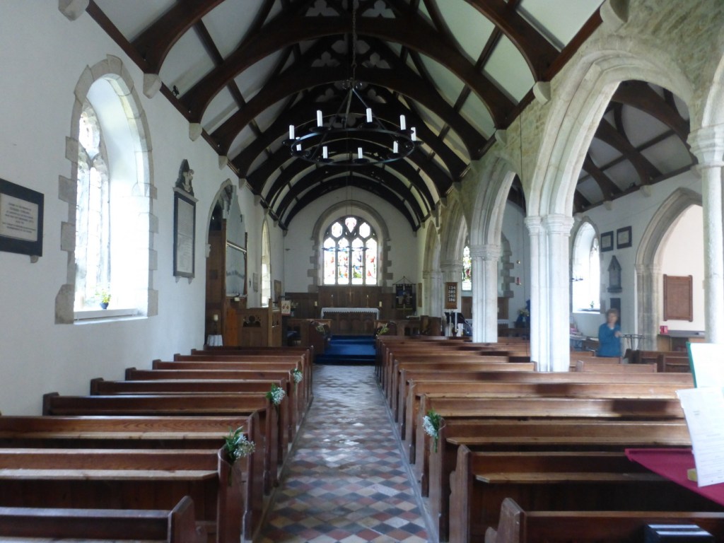Inside, it consists of a nave, south aisle (not north as Pevsner reports) and two small transepts. The roof is distinctly Victorian in feel, as is the stained glass.