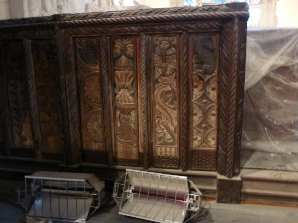 The bottom half of the former C15 rood screen survives, thoughtfully re-coloured, and including a jester blowing a trumpet, a snake winding up it and a goat among thistles.