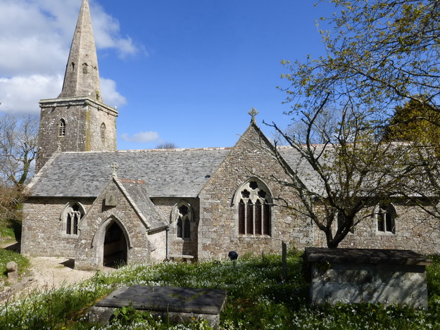 Outside, the are more joys: apart from a churchyard covered in white bluebells and primroses. A post-Roman gravestone known as the Noti Noti stone (to Notus son of Notus) and several crosses or cross shafts line the route to the porch.