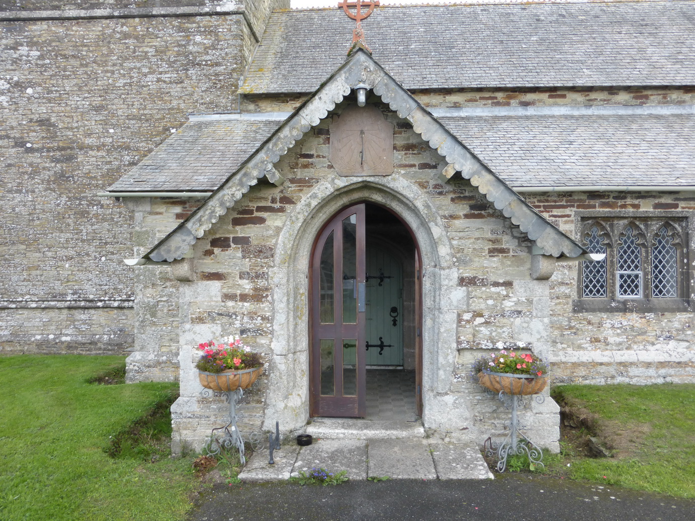 Outside, in the churchyard is a large granite cross of uncertain date while over the south porch door is a 1718 sundial reassuring us that ‘Time for none doth stay, so our lives decay’. A cheery thought to greet one.