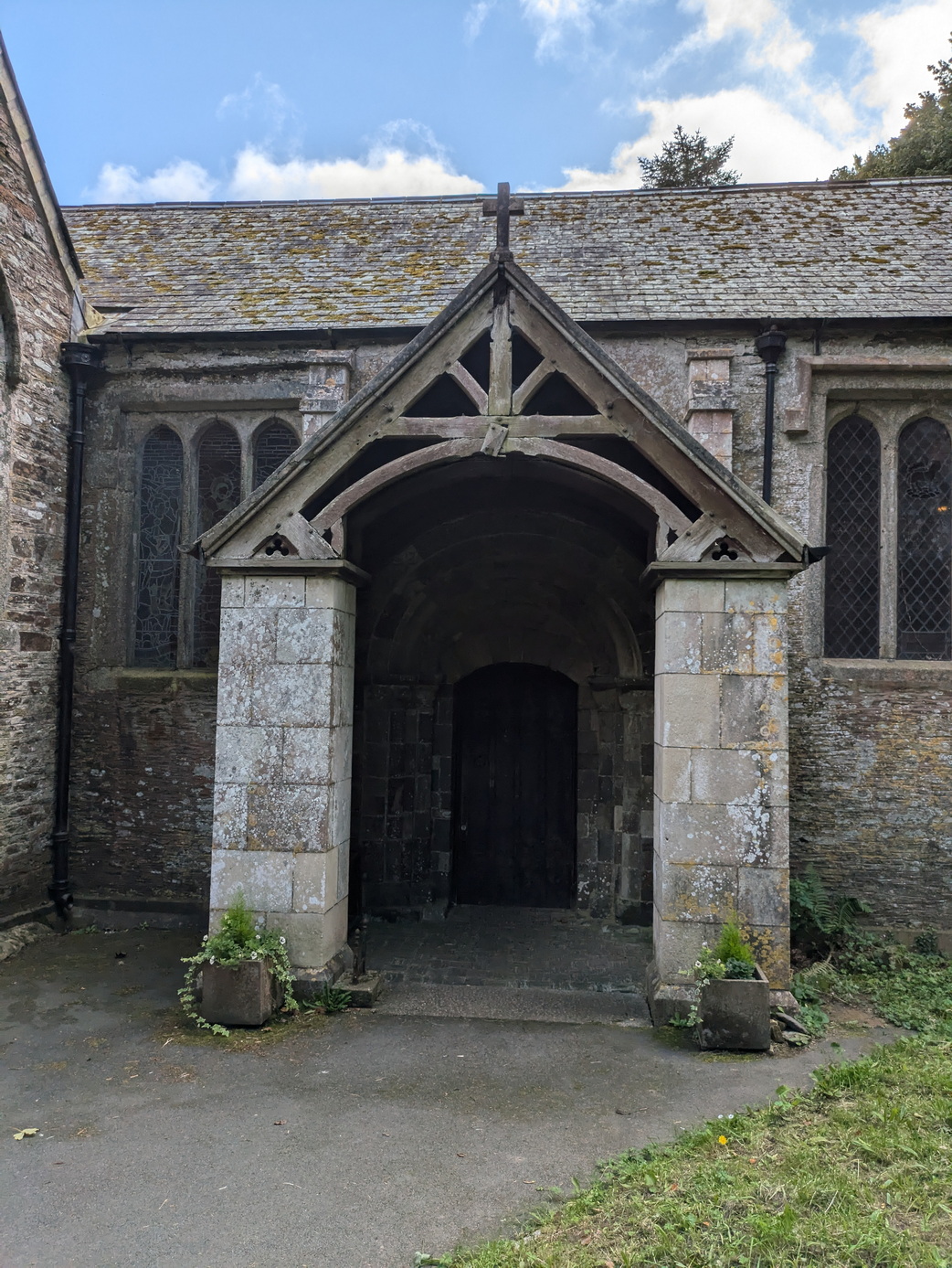 The glory, according to the books, is the Norman doorway, one of the best in Cornwall (Pevsner). It is certainly impressive, but sadly overshadowed by the later porch which protects it from rain but over-dominates.