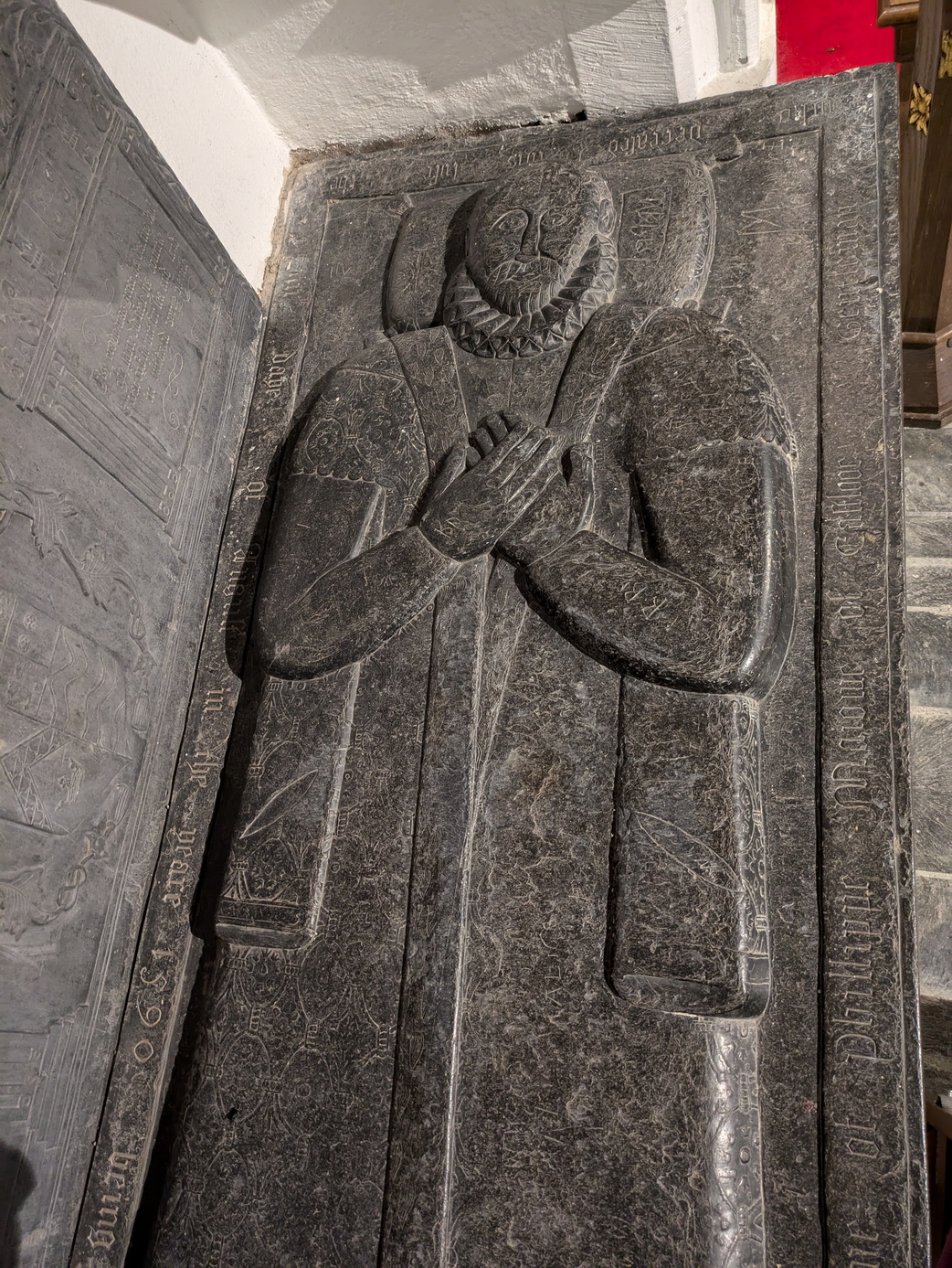 At the east end are two notable monuments. In the sanctuary is a slate table tomb of Philip Mayow d1590 while, what passes for a vestry/storeroom, behind the south aisle altar is a grandiose monument to Walter (and Rhoda) Langdon d1667.