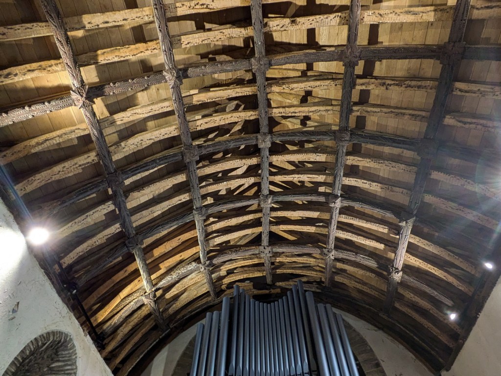 Above, a fine wooden wagon roof, whose wood has been dated between 1453-1478, has been sensitively restored.
