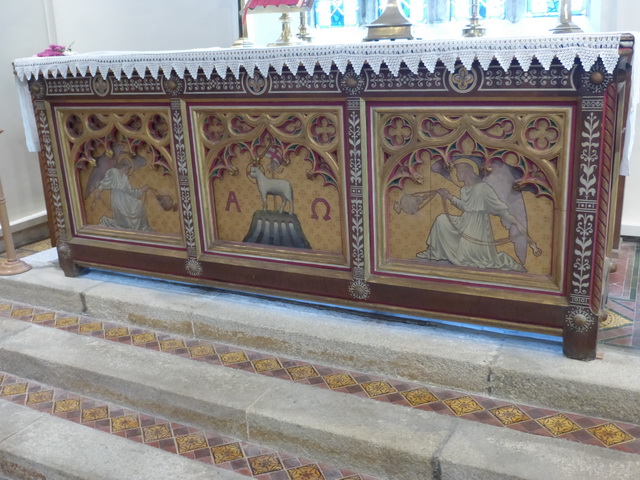 The pulpit was constructed using some C17 bench-ends. The quality is such that one wonders why more bench ends were not rescued. The altar frontal has a refreshing Pre-Raphaelite feel to it with kneeling angels.
